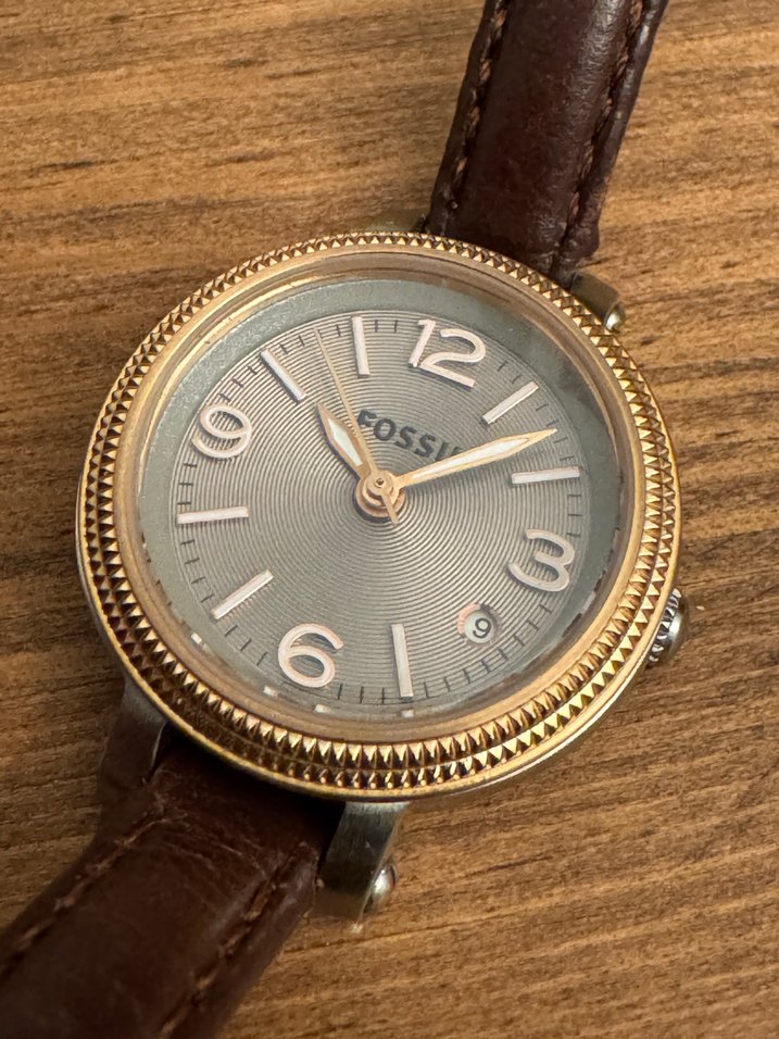 Fossil ES3138 Kahverengi Deri 8 mm – Zarif Kadın Kol Saati Zarif tasarımı, sıcak tonlu kahverengi deri kayışı ve klasik çizgisiyle dikkat çeken bu Fossil ES3138 modeli, hem günlük kullanım hem de özel anlar için ideal bir seçimdir. Teknik Özellikler: • Marka: Fossil • Model: ES3138 • Seri No: 251256 • Mekanizma: Quartz • Kasa: Paslanmaz çelik (Rose-Gold kaplama)  • Kasa Çapı: 26 mm  • Kasa Kalınlığı: ~ 9 mm  • Kayış: Kahverengi deri – genişlik 8 mm  • Cam: Mineral cam  • Su Geçirmezlik: 50 m (165 feet)  • Fonksiyonlar: Saat, dakika, saniye + tarih göstergesi  Durum / Tasarım Notları: Saat genel olarak temiz durumda, çizik ve aşınma minimum seviyede. Orijinal deri kayış korunmuştur.