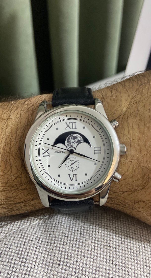 Bu erkek kol saati, beyaz kadran ve gri detaylara sahip klasik gotik tasarımdadır. VI, XI ve XII Roma rakamları ile ay fazı detayı bulunur. Siyah deri kayışlıdır. ⌚ Aktif çalışıyor tertemiz kullanılmadığından satıyorum