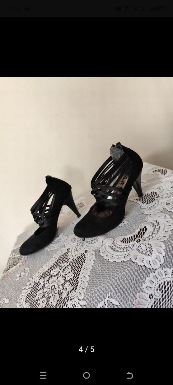 Kemer detaylı, desenli siyah topuklu ayakkabılar, kauçuk malzemeden. Romantik gece için gotik tarzda şık seçim.