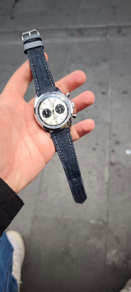 Bu erkek saati, klasik beyaz kadran, siyah alt kadranlar ve gri kumaş kayış ile sokak stilini zamansız tasarımla birleştirir. ⌚sifir sayılır . orjinal hasir korosu yanında