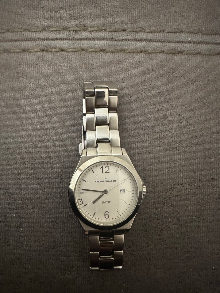 Gri metal kayışlı, tokalı kadın kol saati. Modern klasik tasarıma sahip, Az kullanılmıştır. Grand Romanson
