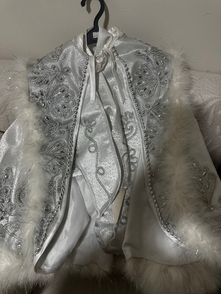 Klasik şıklık sunan, gri nakışlı ve kürk detaylı, kesimi s beden tahmini 2/3 yaş uyumlu sünnet elbisesi takımı ayakkabı 20 numaradır papyon bel kemeri yelek pelerin ve ayakkabı mevcuttur içerisinde s beden yazmaktadır