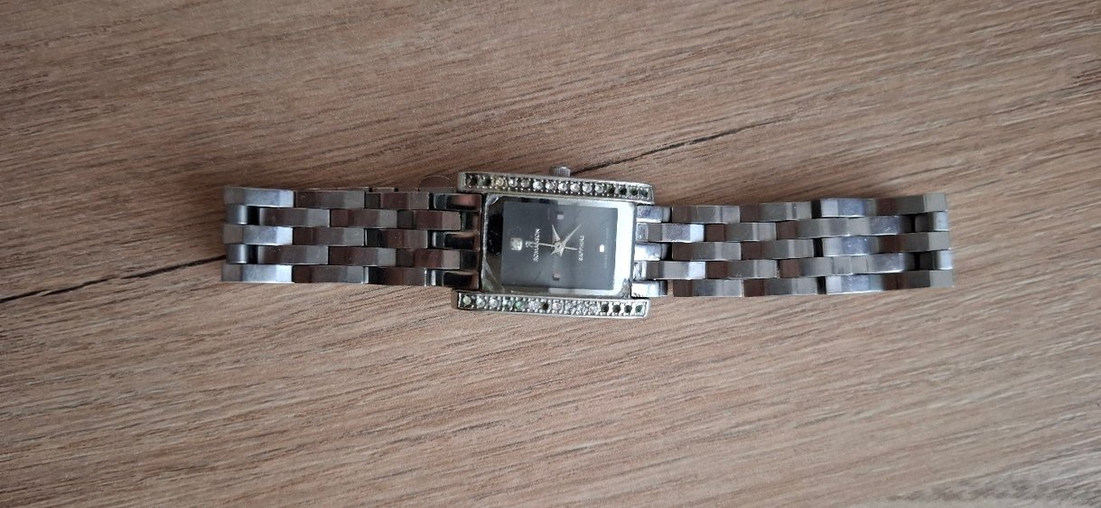 Kadınlar için gri dikdörtgen kadranlı, taşlı çerçeveli ve tokalı metal kayışa sahip çağdaş ve klasik tarzda saat.