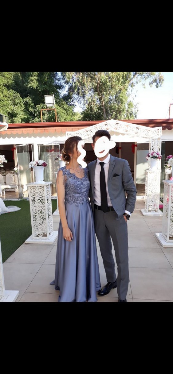 Kolsuz, uzun gri nişan elbisesi, kesik yakalı ve yırtmaçlı, modern klasik ve Paris tarzı şıklık sunar.