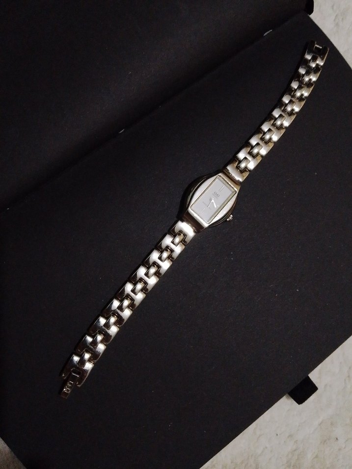 Parlak gümüş renkli, tokalı kayışa sahip klasik tarzda kadın kol saati. Zamansız ve hafif eski moda görünümü vardır. ⌚