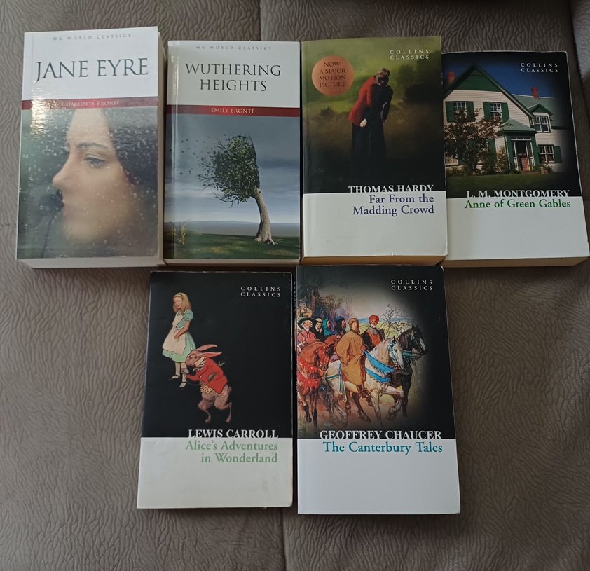 İLAN AÇTIRIN!! Hepsinin dili İngilizce. Wuthering Heights, Far From the Madding Crowd, Alice's Adventures in Wonderland ve The Canterbury Tales gibi klasik edebiyat kitaplarından oluşan bir set. Kitap başına 300.