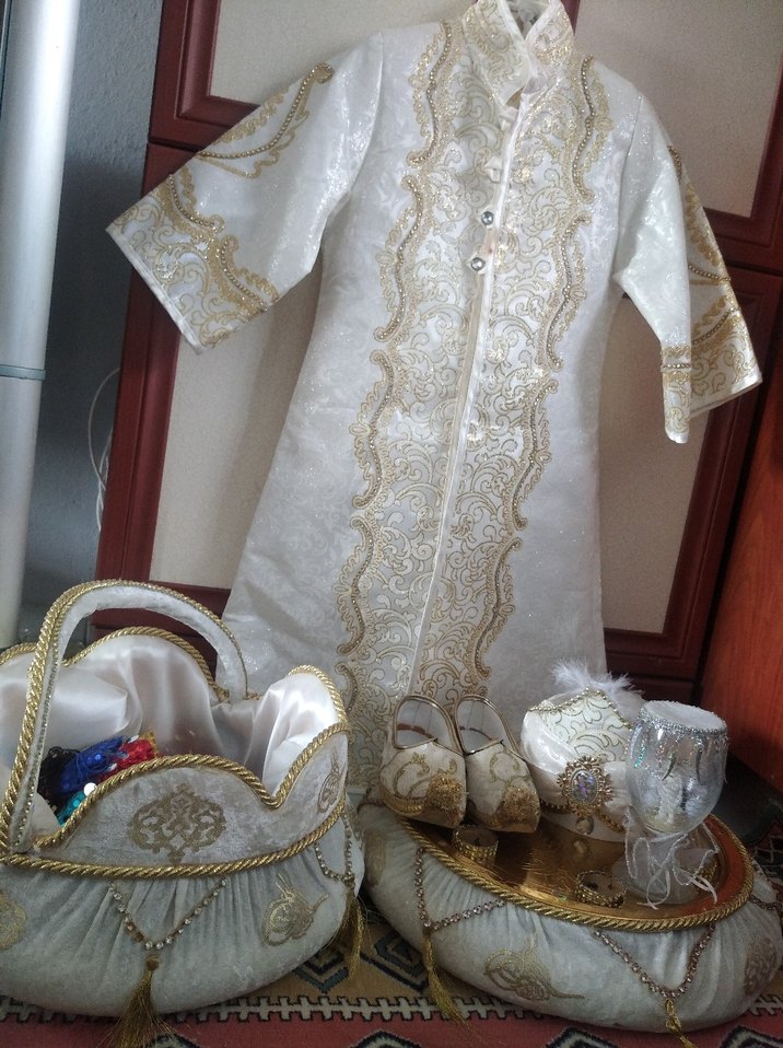 Kısa kollu, yakası kesimli ve işlemeli dantel detaylı, klasik zarafeti yansıtan beyaz, vücuda oturan çocuk takımı. sunnetlik tam takım detaylı bilgi verilir