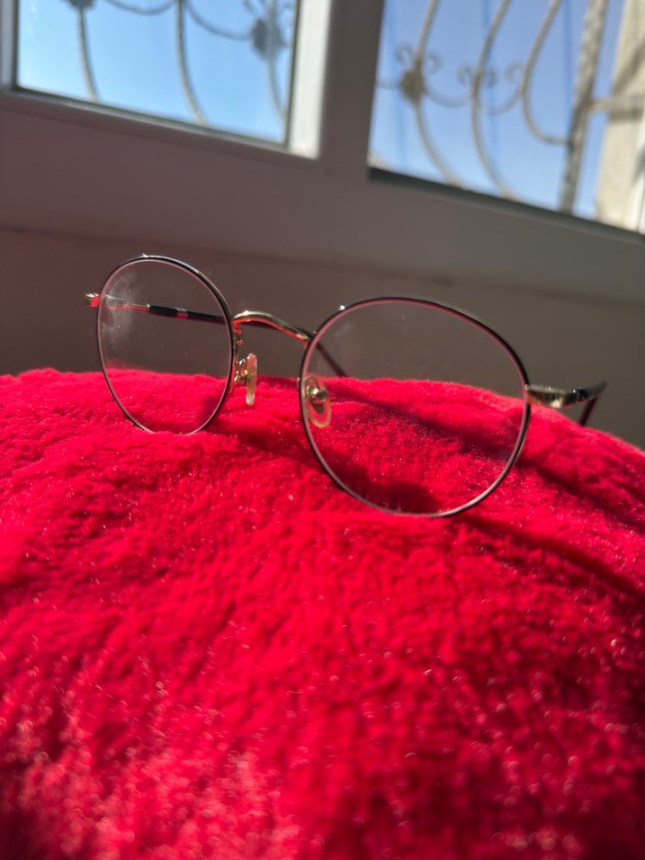 Yuvarlak klasik kırmızı gözlüğü, kulak ucunda ince detaylarıyla nostaljik bir tarz sunar.