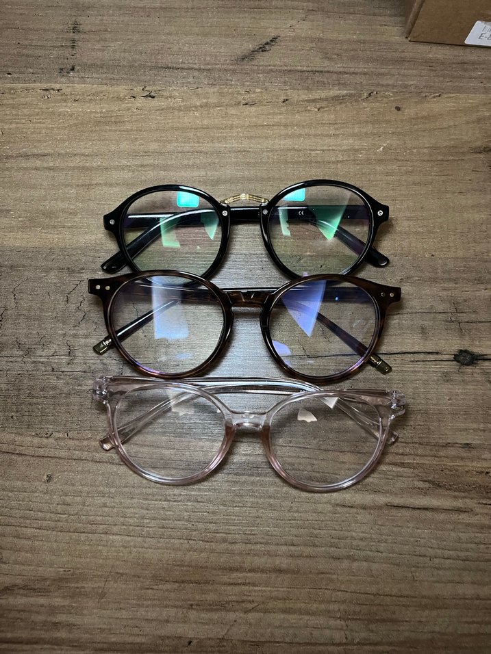 Klasik tarzda üç adet kadın gözlüğü; koyu kahverengi ve şeffaf çerçevelerle, yuvarlak camlı çağdaş tasarımlar.