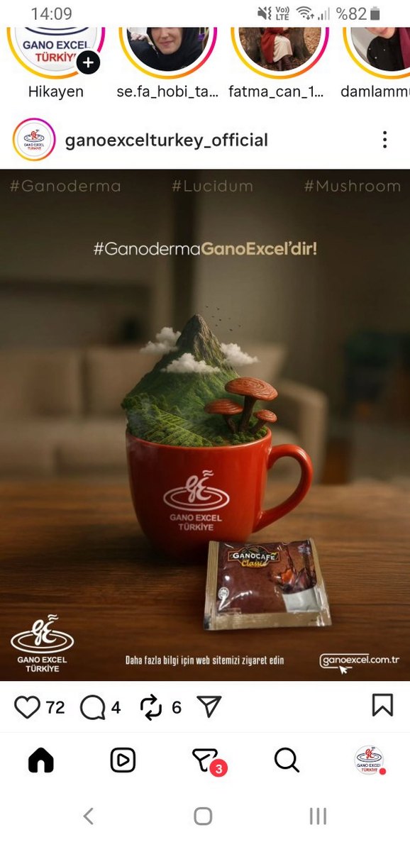 Gano Excel logosu bulunan koyu kahverengi seramik kupa, yanında kahve paketi ile birlikte. Kupa üzerinde Ganoderma mantarı görseli yer alıyor. ☕
