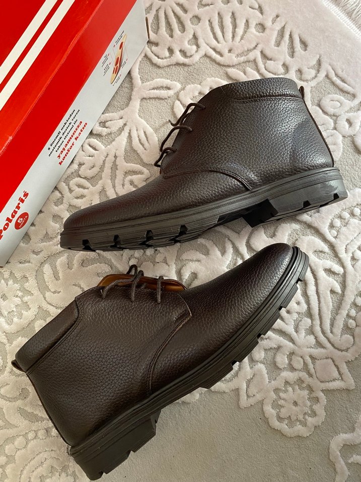 Koyu kahverengi deri erkek botlar, bağcıklı ve klasik şıklıkta, ofis için uygun, desen içermeyen konvansiyonel bir tarza sahiptir. Bir kere kullanıldı. Hiçbir problemi yok.