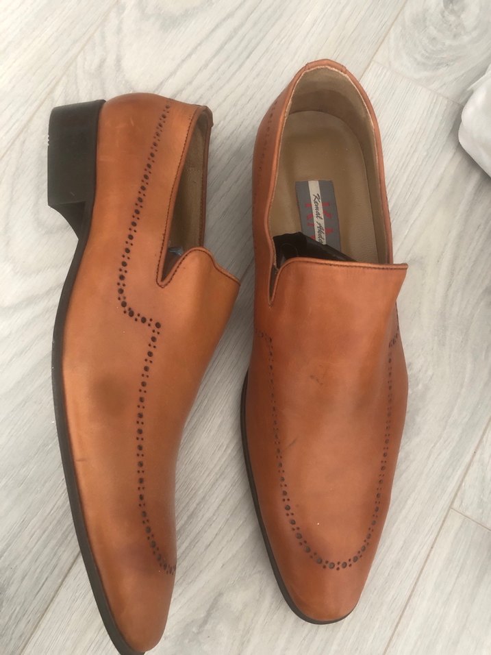 Parlak kahverengi deri erkek klasik ayakkabılar, ince delikli detaylarla süslenmiş.rahat ve şık bir tercih.