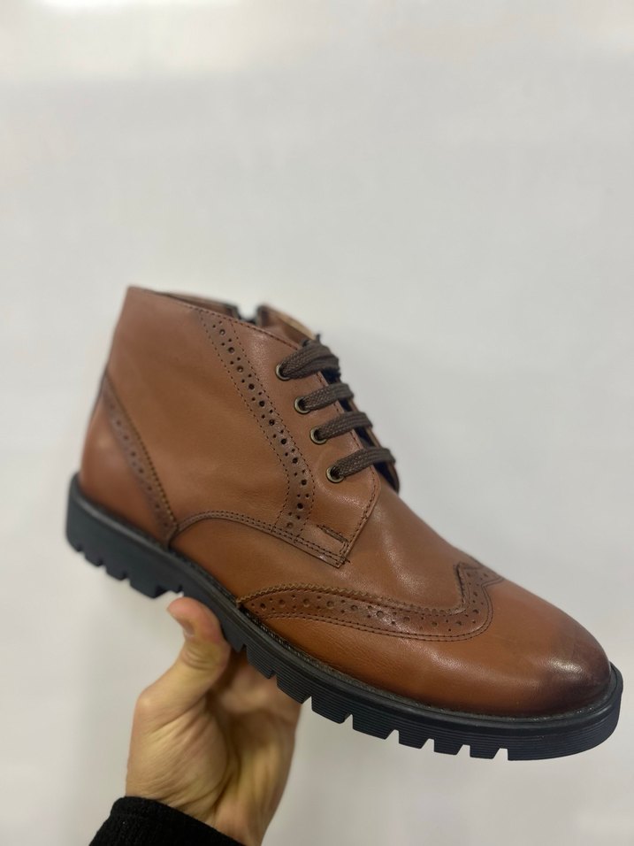 İç dış deri Parlak kahverengi deri erkek bot, bağcıklı ve klasik tarzda, ofis kullanımı için uygun. Dayanıklı taban ve klasik detaylar içerir.