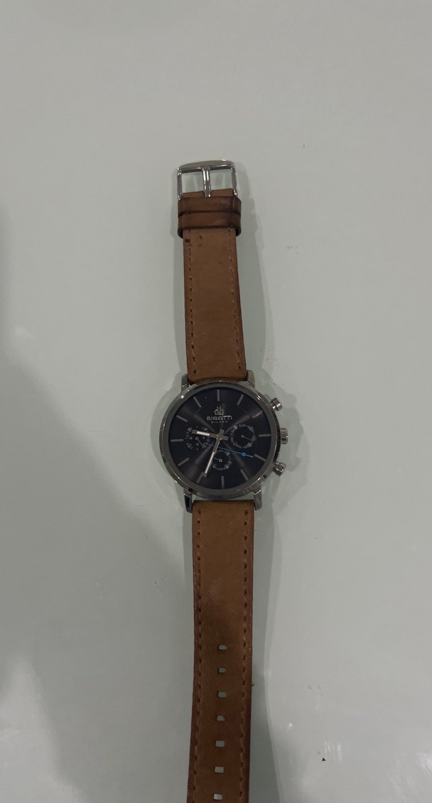 Kahverengi deri kayışlı, siyah kadranlı ve çoklu alt kadranlara sahip klasik ve çağdaş tarzda erkek saati. ⌚