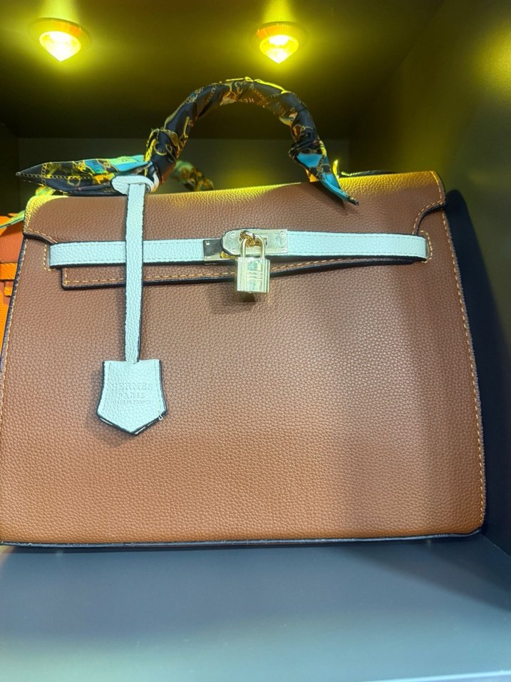 Kahverengi deri, tokalı kadın çanta. Sap kısmı renkli desenli fularla süslenmiş, klasik zarafeti yansıtıyor.