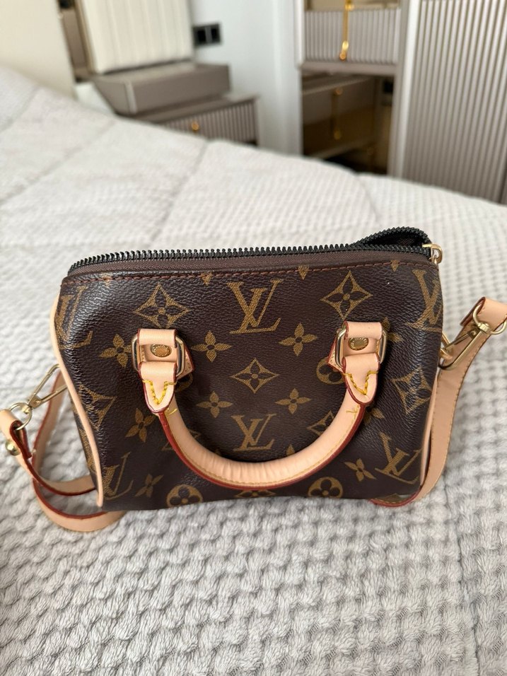 Koyu kahverengi deri kadın çanta, baskılı desen ve fermuarlı kapanışa sahiptir. Modern klasik tarzıyla günlük kullanıma uygundur.