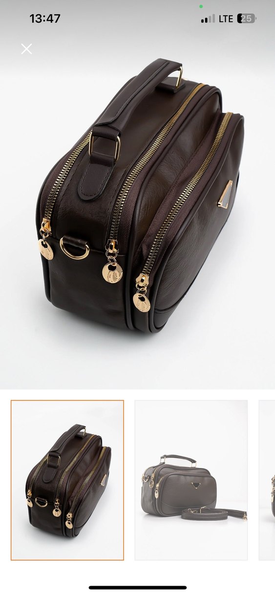 Koyu kahverengi deri kadın çanta, çoklu fermuarlı bölmeler ve klasik biker tarzıyla minimal ve günlük kullanıma uygun.