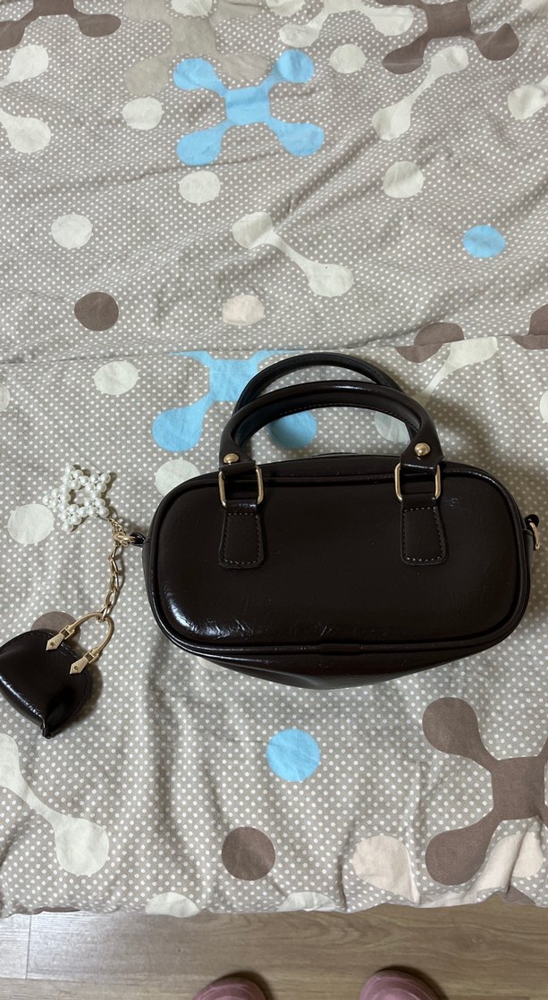 Kahverengi deri çanta, tokalı detay ve küçük kalp aksesuarı ile klasik ve gotik tarzı yansıtıyor.