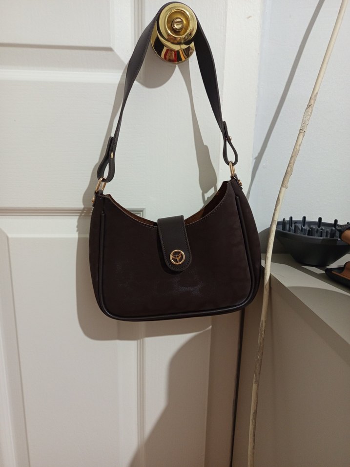 Koyu kahverengi deri çanta, tokalı askı ve modern klasik tasarıma sahip, günlük kullanıma uygun Paris tarzı şıklık sunar.