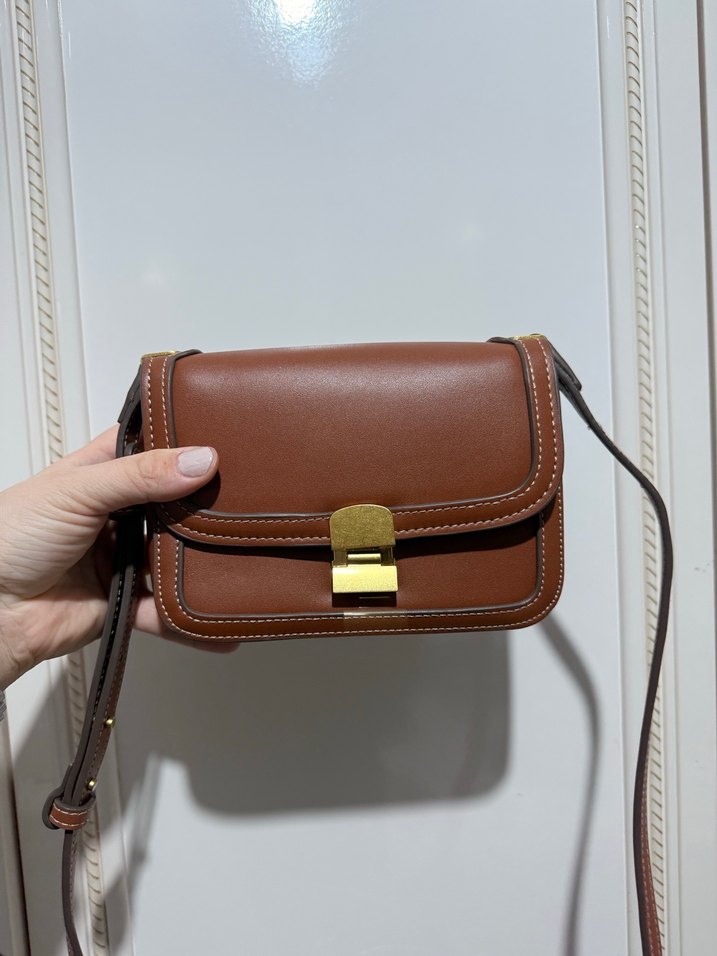 Koyu kahverengi deri kadın çanta, tokalı kapama ve minimalist modern klasik tasarıma sahiptir. Günlük kullanıma uygundur, klasik zarafeti yansıtır. Kusursuz