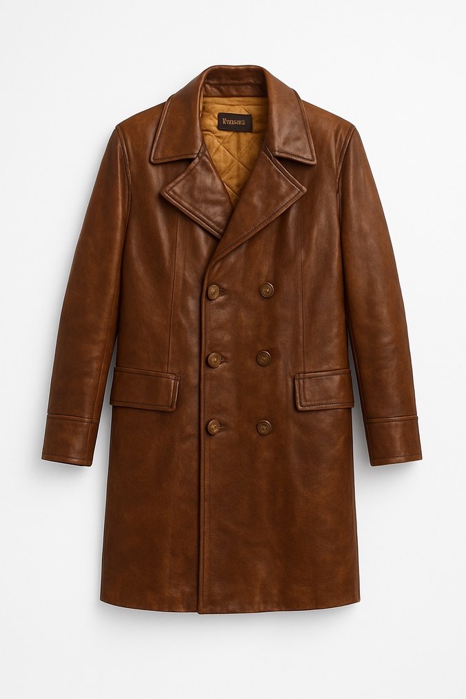 Kahverengi deri, parlak yüzeyli erkek kaban, düğmeli ön ve kesik yaka ile klasik şıklık sunar. Uzun kol ve uzun boy, ofis kullanımı için uygundur.