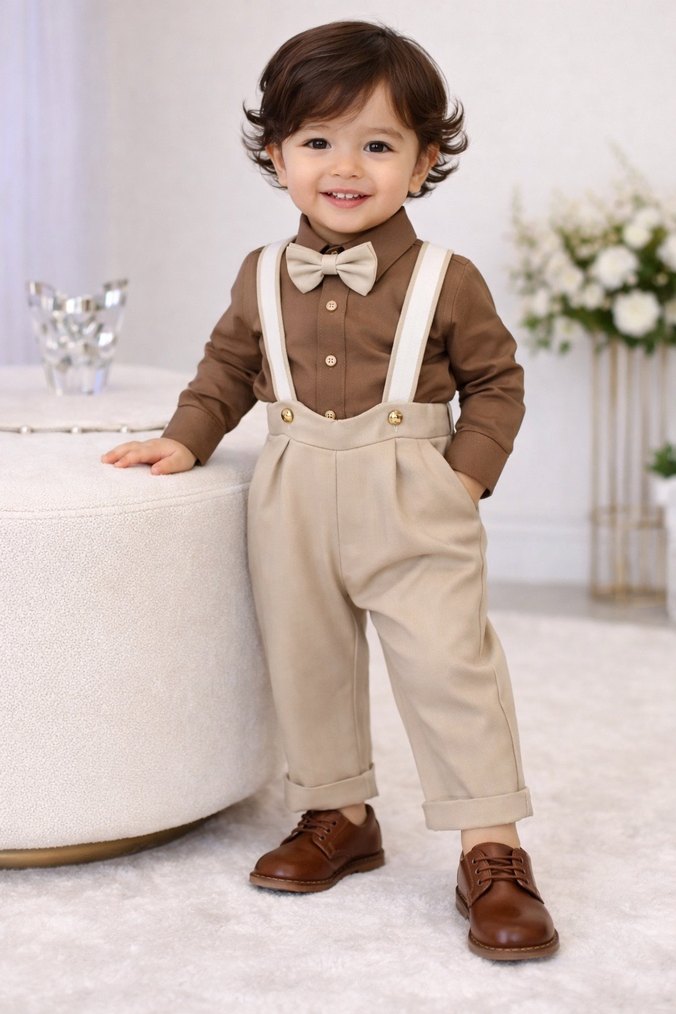 Kahverengi uzun kollu, düğmeli ve yakalı gömlek, bej askılı pantolon ile klasik tarzda çocuk takımı.