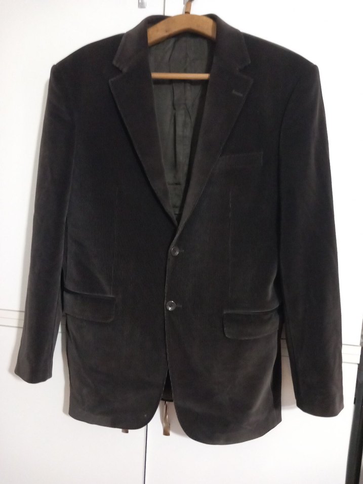Kahverengi erkek ceket, klasik kesim, uzun kollu ve normal boyda. Düğmeli ön kısmı ofis kullanımı için uygun, desensiz ve sade tasarıma sahip.
