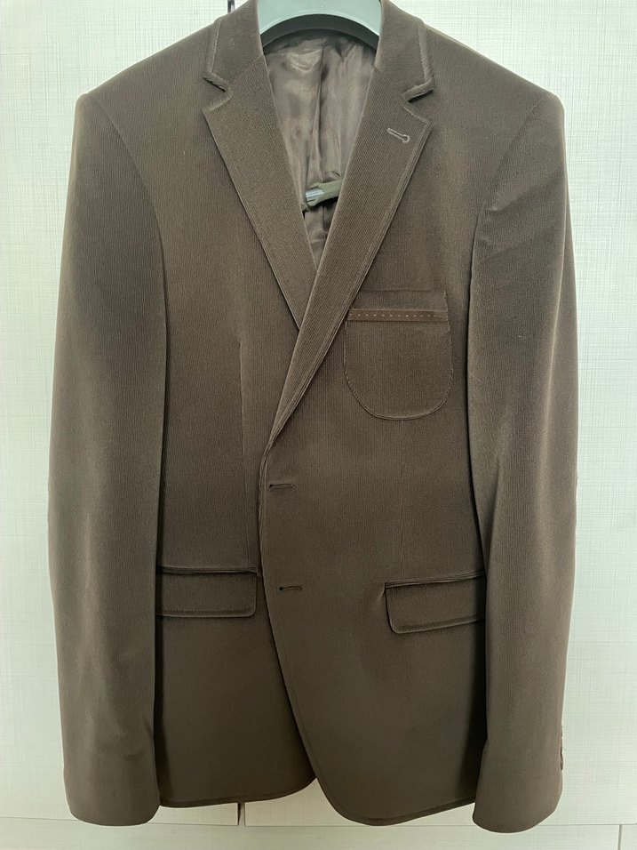 Kahverengi, düğmeli, klasik kesim erkek takım elbise. Uzun kollu ve normal boyda, ofis için uygundur. Kadife kumaştır