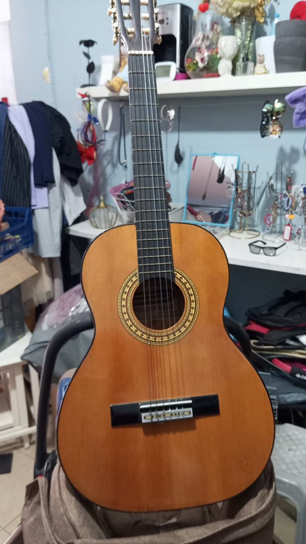 Altı telli, kahverengi klasik gitar, ses deliği çevresinde renkli dekoratif bir rozet ile birlikte. sap kısmında küçük bir çatlak var onun dışında hiçbir sıkıntısı yok
