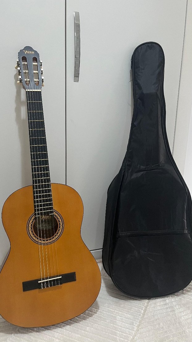 Kahverengi klasik gitar, altı telli ve siyah yumuşak taşıma kılıfı ile beraber.