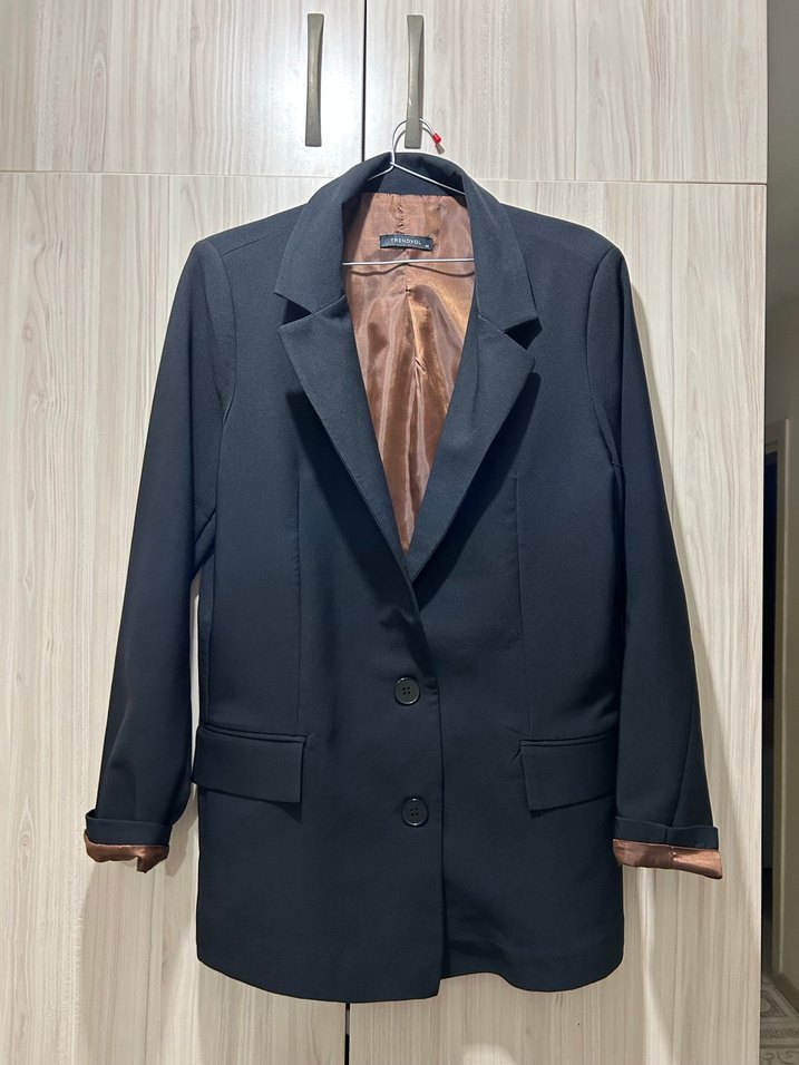 Kahverengi, düğmeli, klasik kesim kadın blazer ceket. Uzun kollu, normal uzunlukta, ipeksi dokuda ve ofis için uygun.