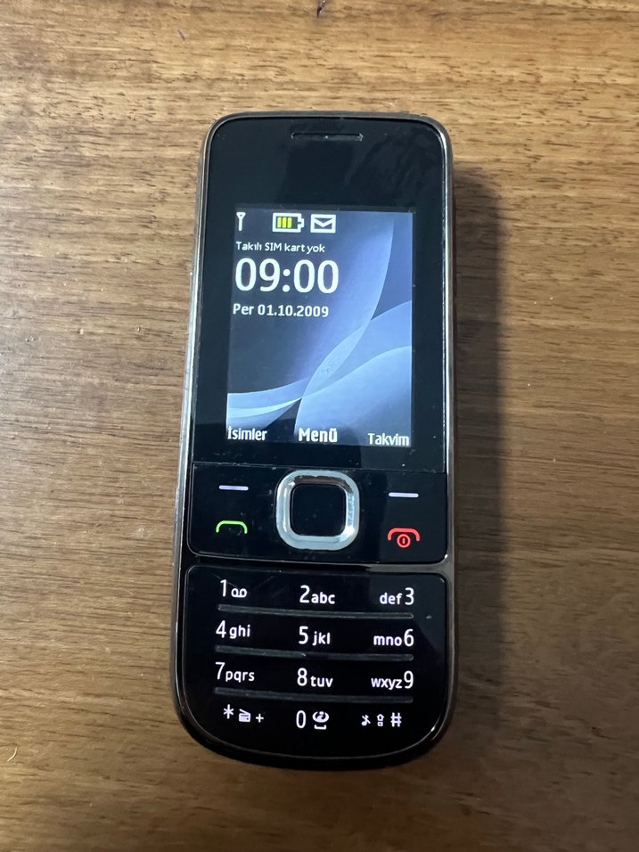 Küçük ekranlı, kahverengi klasik tuşlu telefon. Saat ve tarih bilgisi görünür, arama ve menü tuşları bulunur.