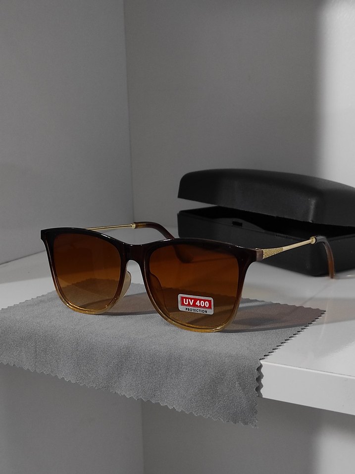 Klasik şeffaf koyu kahverengi çerçeveli, UV400 korumalı kadın güneş gözlüğü, trend sokak stiline uygundur. ️