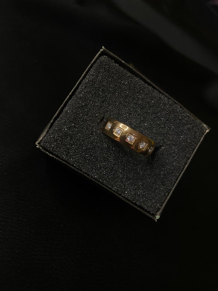 Küçük taşlı kemer detaylı koyu altın renkli yüzük. Romantik gece için minimalist ve zamansız tarzda.