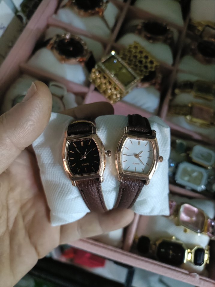 Kahverengi deri kayışlı, kemerli, modern klasik tasarımlı iki kadın kol saati. Biri siyah kadran, diğeri beyaz kadran, her ikisi altın tonunda kasaya sahip. ⌚
