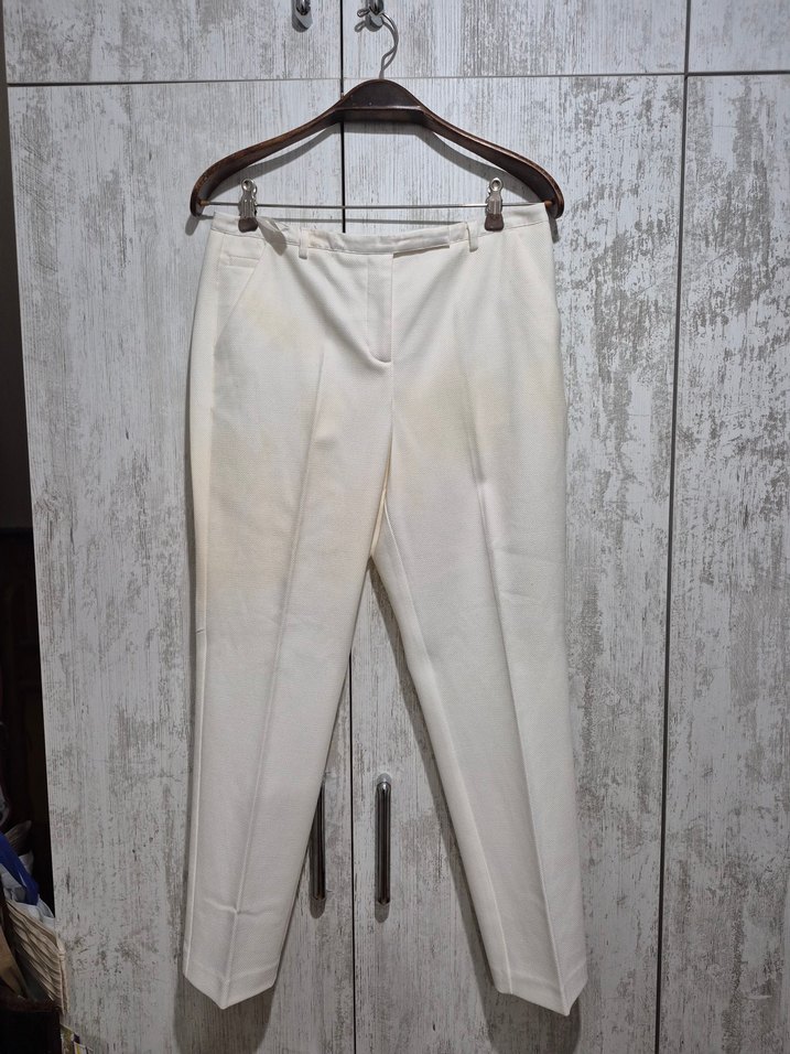 Beyaz keten kumaştan, klasik kesim ve midi boy kadın pantolon. Minimalist ve normcore tarzıyla ofis için zarif ve rahat bir seçenek. ✨