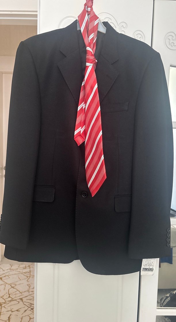 Erkek siyah takım elbise, klasik kesim, uzun kollu ve kesik yaka detaylıdır. Ofis kullanımı için uygundur, orta boy ve kemerli yapıya sahiptir. ️kravat dahildir