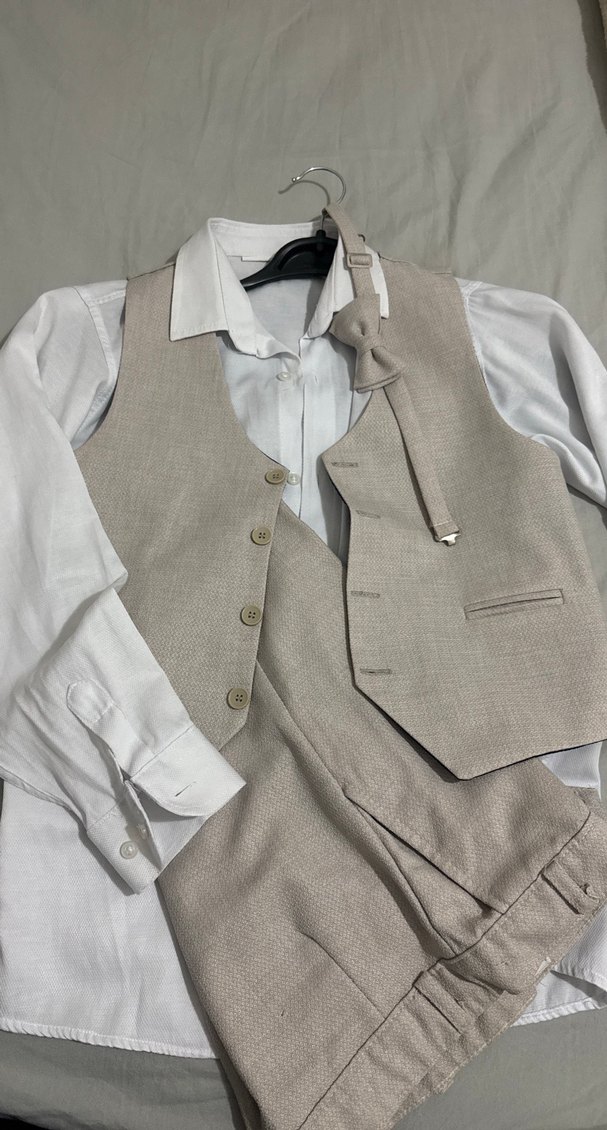 Modern klasik tarzda, düğmeli, kesik yakalı gri çocuk yelek takımı, beyaz uzun kollu gömlek ve uyumlu gri pantolon ile tamamlanmıştır.