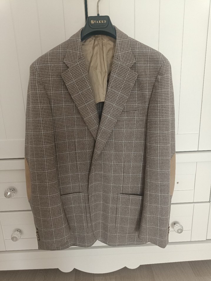Düğmeli, klasik kesim kahverengi erkek ceket, düz desenli ve uzun kolludur. Ofis kullanımı için modern klasik tarzda, normal boyda midi uzunluğundadır.