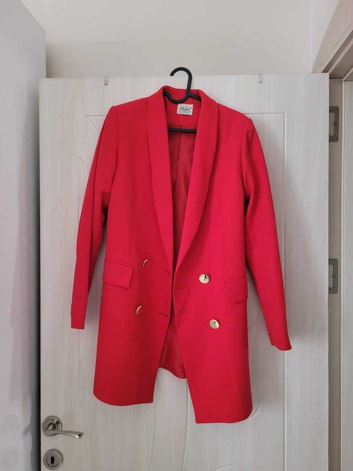 Düğmeli, kırmızı kadın blazer, klasik kesim ve normal midi boyda. Uzun kollu, sentetik kumaştan, ofis stiline uygun renkli tasarım.