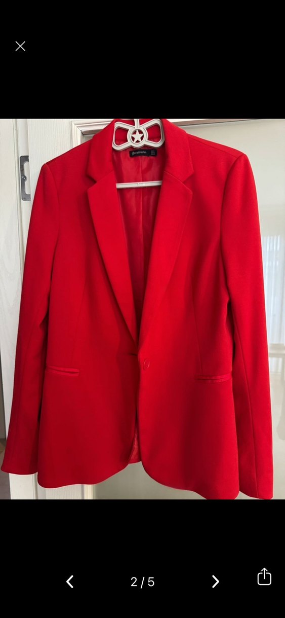 Kırmızı kadın blazer, klasik kesim, yaka detaylı, uzun kollu ve düğmeli. Ofis için uygun, modern klasik tarzda, düz ve midi boyda, sentetik kumaştan yapılmıştır.
