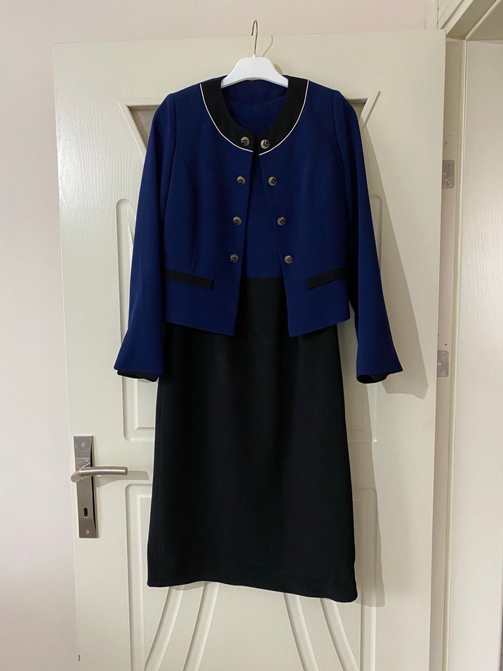 Uzun kesim, klasik kesime sahip lacivert kadın takım elbisesi. Düğmeli ceket ve uzun kollu tasarımı ile kalem elbiseli takım