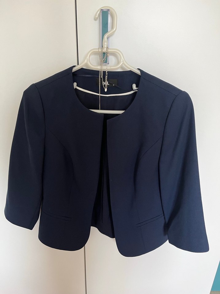 Bu lacivert kadın blazer, klasik kesim, uzun kollu ve düğmeli ön detaylıdır. Notlu yaka ve midi boyda, ofis kullanımı için uygundur.
