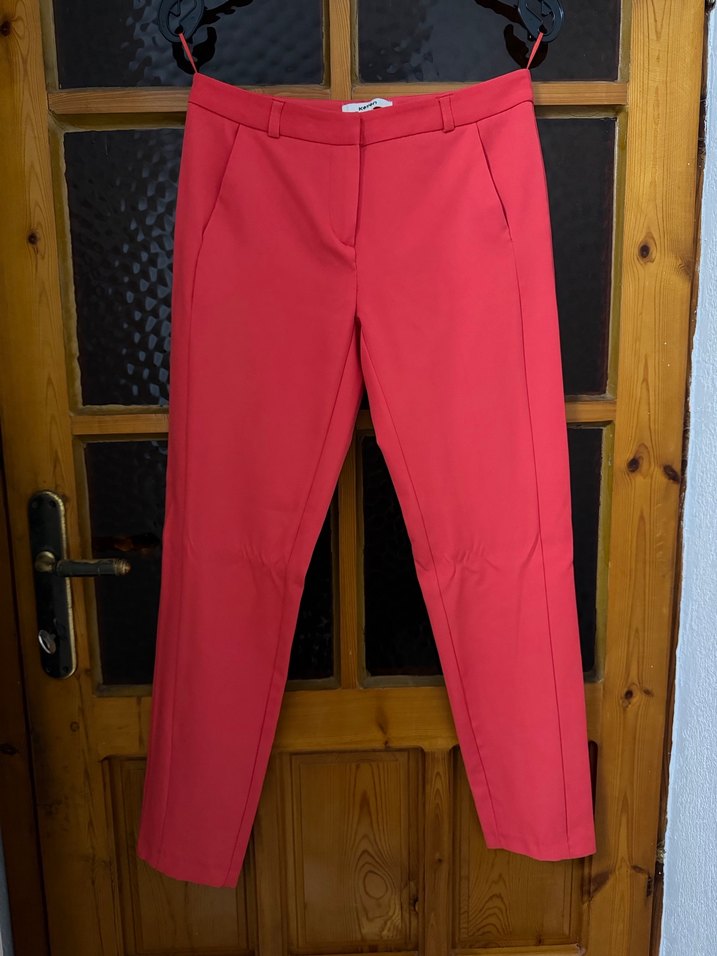Koyu pembe renkte, klasik kesim ve midi boy kadın kumaş pantolon. Sentetik kumaştan üretilmiş, fermuarlı ve desen içermeyen tasarımı ile ofis için uygundur.