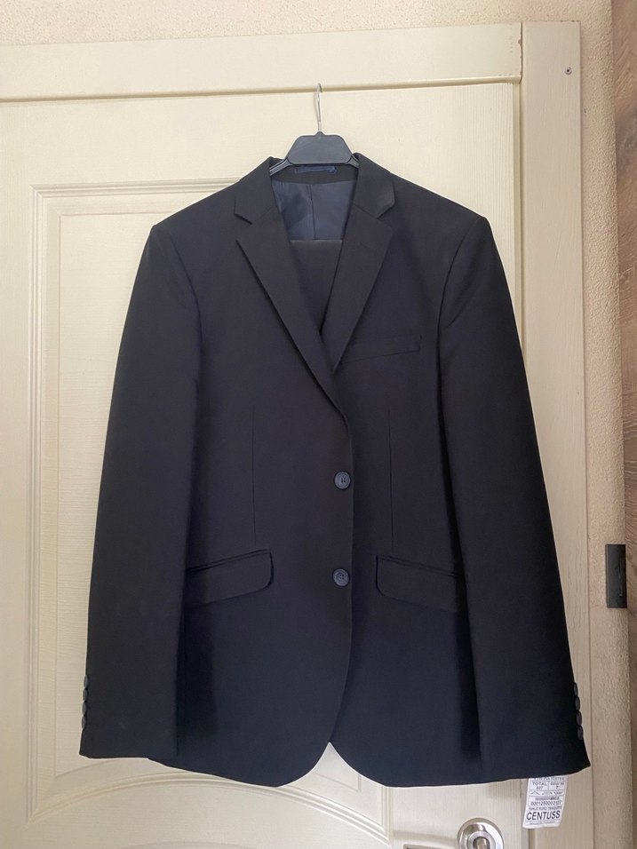 Siyah renkli, klasik kesim erkek takım elbisesi. Uzun kollu, kesik yaka ve düğmeli ön tasarıma sahip, iş ortamı için uygun. ️