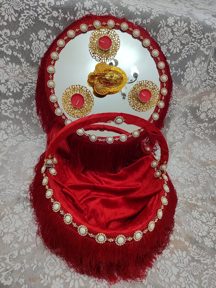 Parlak kırmızı renkte, boncuk işlemeli klasik düğün aksesuar seti. İnci ve püskül detaylı ayna ve sepet içerir. Zarif ve gösterişli.