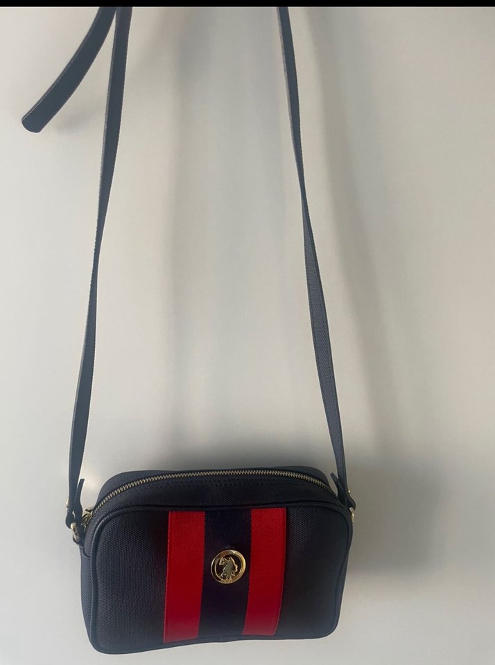 Koyu deri gövdesi ve kırmızı çizgili detaylarıyla, kemerli tasarıma sahip kadın çapraz çanta. Klasik zarafeti Paris sokak modasıyla buluşturur. Günlük kullanım için uygun. Son fotoğrafta göründüğü üzere bir ip çıkmıştır. Tek kusuru budur.
