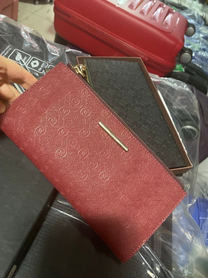 Koyu kırmızı deri üzerine baskılı desen ve fermuarlı kapanışıyla modern klasik tarzda, Paris esintili günlük kullanıma uygun kadın cüzdanı.