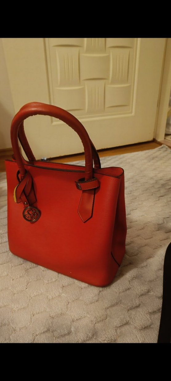 Parlak kırmızı deri çanta, tokalı kulpları ve desen içermeyen yüzeyiyle klasik ve çağdaş tarzda günlük kullanıma uygun.