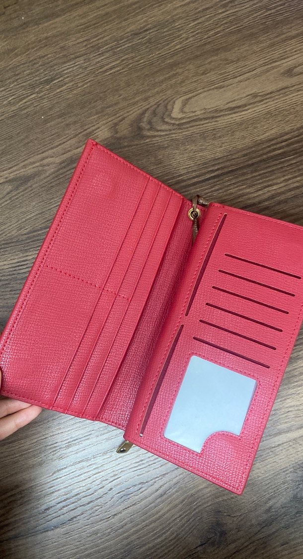 Koyu kırmızı deri kadın cüzdanı, fermuarlı ve desensiz yüzeye sahip olup klasik zarafeti modern iş tarzıyla birleştirir. Ofis kullanımı için uygundur.